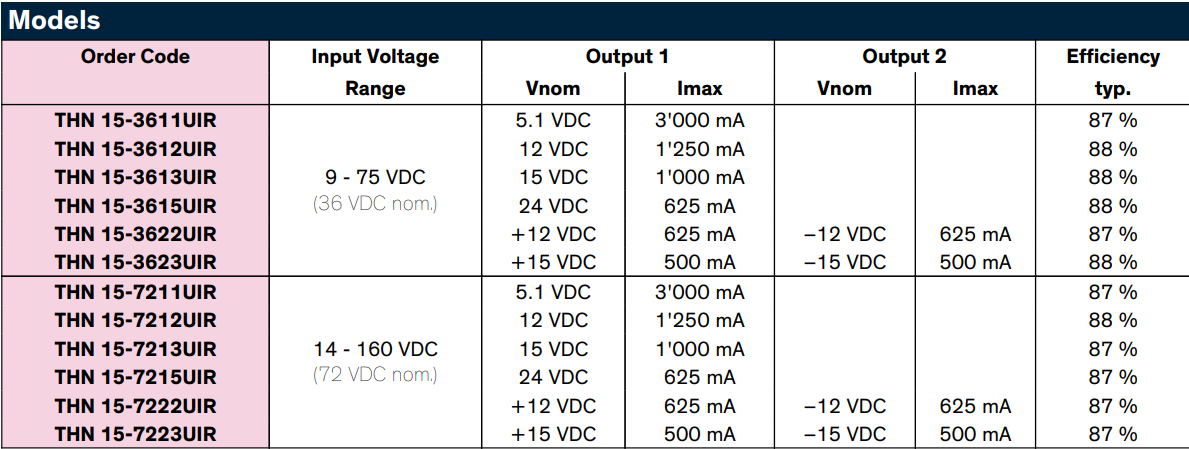 - TRACO POWER稳压电源模块THN15-3611UIR THN15-3612UIR THN15-3613UIR