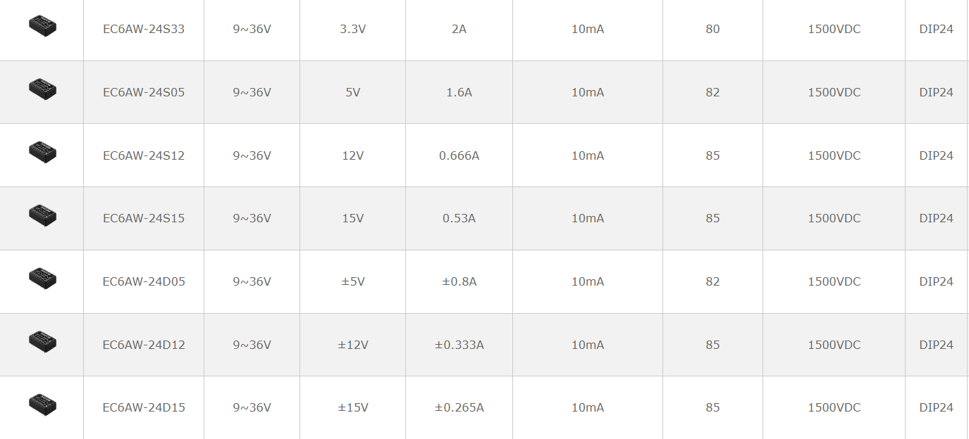 品牌:CINCON 型号:EC6AW-24S15 加工定制:否 输出电流:3 A 输入电压:DC9-36V V 输出电压:DC5-15 V 输出功率:10 W 频率范围:300KHZ 工作温度:-40--85度 ℃ EC6AW系列8W电源变换器EC6AW-24S05 EC6AW-24S12 EC6AW-24S15 EC6AW-24D12 EC6AW-24D15