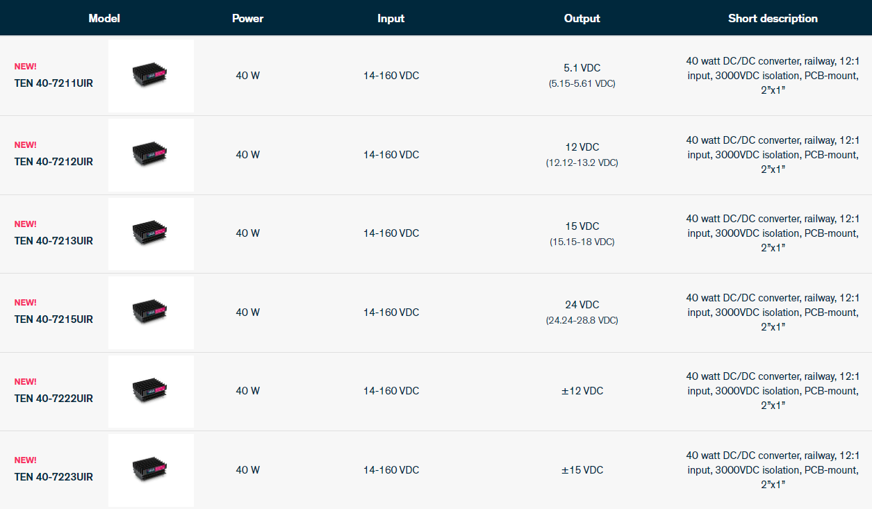 品牌:TRACO 型号:TEN40-7211UIR TEP40-7212UIR 加工定制:否 输出电流:8 A 输入电压:DC14-160 V 输出电压:5-48 V 输出功率:40 W 频率范围:300KHZ 工作温度:-40--70 ℃ TRACO铁路直流电源TEN40-7211UIR TEP40-7212UIR TEN40-7213UIR TEP40-7215UIR