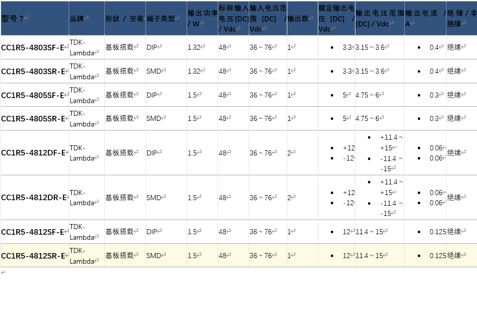 品牌:TDK 加工定制:否 型号: CC1R5-4812DF-E CC1R5-4803SF-E 输出电流:0.5 A 输入电压:DC36-72 V 输出电压:DC3.3-15 V 输出功率:1.5 W 负载调整率:+/-2% 显示精度:+/-2% TDK微功率稳压电源CC1R5-4805SF-E CC1R5-4812SF-E CC1R5-4812DF-E CC1R5-4803SF-E
